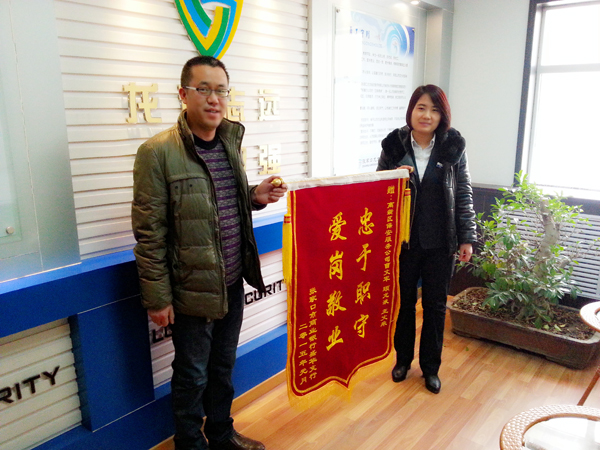 2015年1月份,一位八十多歲高齡的老人到張家口市商業(yè)銀行某支行辦理取錢業(yè)務(wù)時(shí),因老人年事已高患有老年病,與銀行的工作人員發(fā)生了沖突,無論工作人員如何解釋,仍無法溝通,至此,老人經(jīng)常到該行找工作人員滋事,老人的行為嚴(yán)重影響到支行的正常業(yè)務(wù),為客戶辦理業(yè)務(wù)帶來了不便,為維護(hù)好銀行正常秩序,我公司派駐支行的保安隊(duì)員顧龍液、王文來,主動(dòng)接近老人進(jìn)行勸阻,交流溝通,問寒問暖,緩解老人心態(tài)。之后我公司曹文平隊(duì)長得知此事,也趕到支行協(xié)助處理,幫忙找到了老人的家人,在家人的勸說下,老人離開了支行,支行恢復(fù)了正常的工作秩序。經(jīng)過此事,我公司保安大隊(duì)長曹文平及派駐到張家口市商業(yè)銀行的保安隊(duì)員顧龍液、王文來受到了張家口市商業(yè)銀行支行領(lǐng)導(dǎo)的高度贊揚(yáng),特到我公司送來了錦旗與表揚(yáng)信,對我公司進(jìn)行感謝。