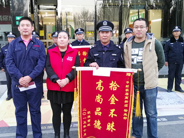 2015年10月23日18是許,保安李明寶在當(dāng)日營業(yè)結(jié)束清場檢查時,在張家口華耐高新店商場南區(qū)3層衛(wèi)生間撿到1只皮挎包,立即教到物業(yè)部值班室,經(jīng)值班人員共同檢查,內(nèi)有包括汽車鑰匙、多張信用卡、駕駛證等物品。19時30分,失主前來尋找。次日上午,為感謝李明寶,失主專程送來“拾金不昧,品德高尚”錦旗一面。