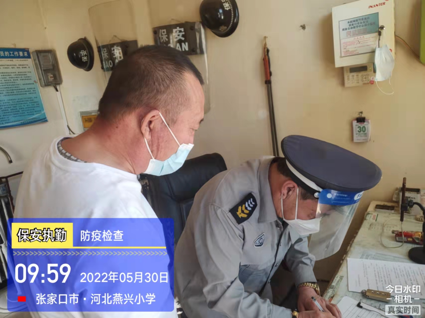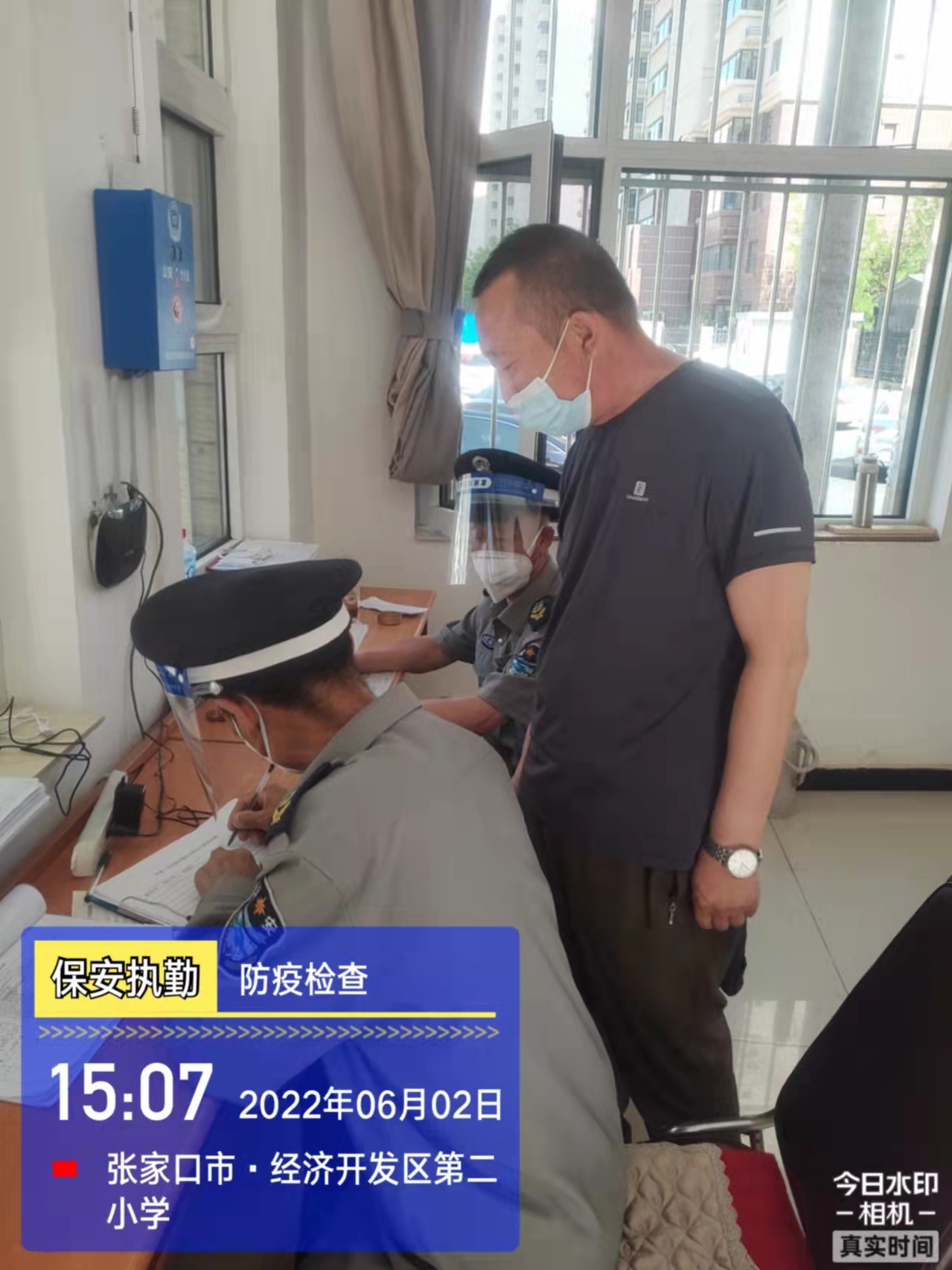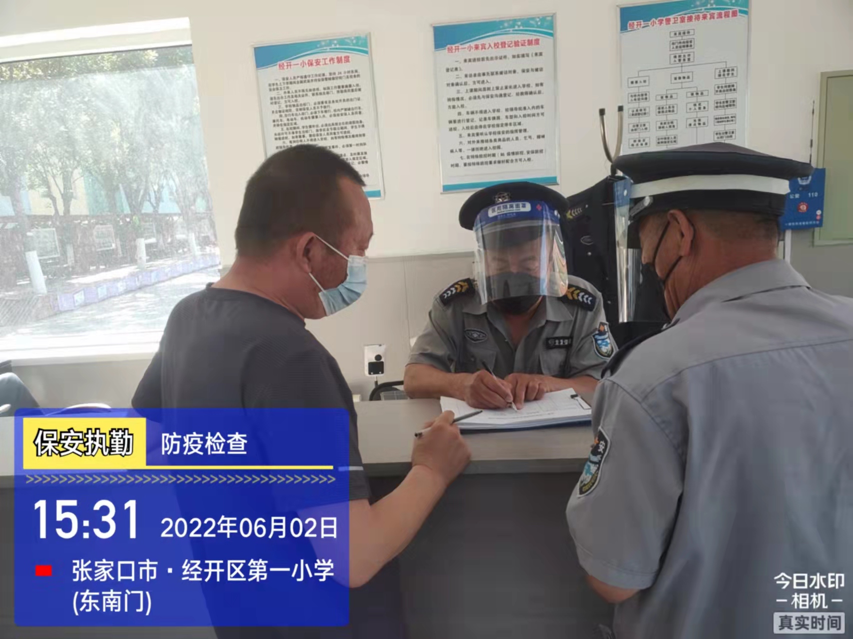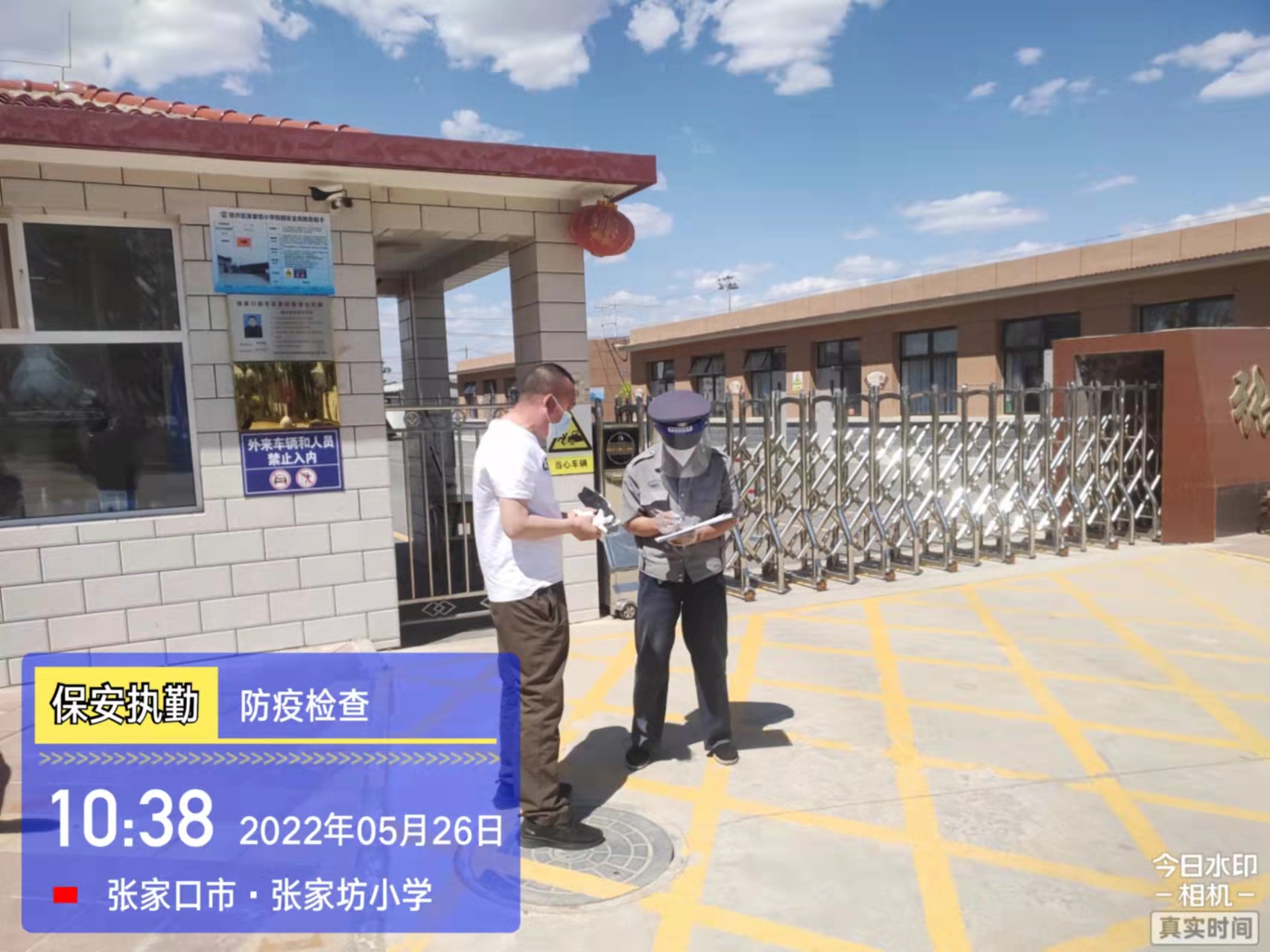 會后,我公司迅速召開“疫情期間學校門衛(wèi)安全防控工作要求”的會議,制定了校園安全防疫規(guī)定:疫情防控期間,校園保安隊員必須穿制服,規(guī)范佩戴“三件套”(防護隔離面罩、N95口罩、一次性PVC手套);進出校園的師生必須測量體溫,外來人員需登記、測溫、掃碼(幸福張家口,呈綠碼)、且持7日內(nèi)核酸陰性檢測結(jié)果;保安室需保持干凈整潔,物品擺放有序,勤開窗通風,定期噴灑消毒藥水。為此,公司特成立校園防疫檢查小組,由副經(jīng)理帶隊,協(xié)同主管大隊長對經(jīng)開區(qū)所有中小學校安保崗位進行防疫工作檢查,檢查期間,發(fā)現(xiàn)問題,現(xiàn)場處理,并及時與校方領(lǐng)導溝通,杜絕同樣問題再次出現(xiàn),確保校園防疫安保工作萬無一失,為各校師生鑄就一道安全防線!